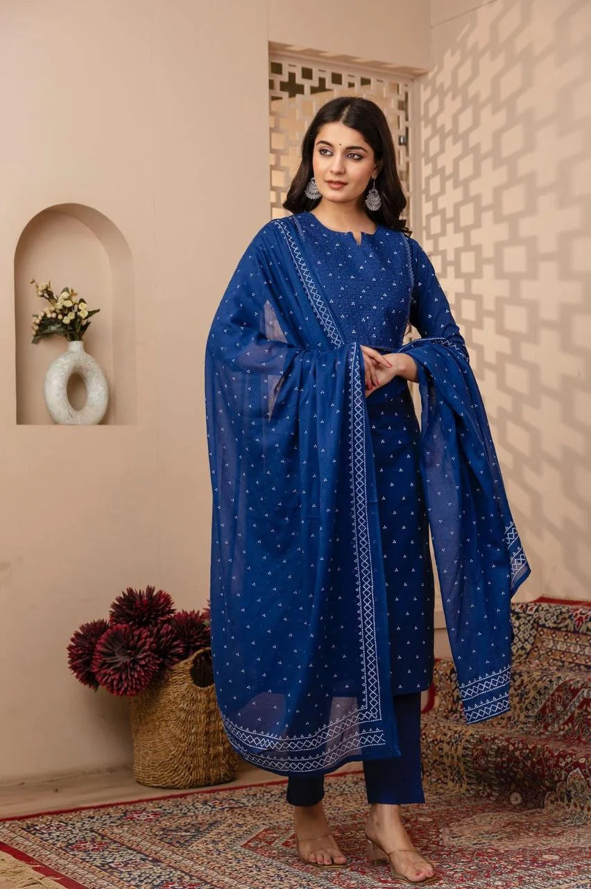 Made from premium-quality cotton, the fabric is soft, breathable, and gentle on the skin, keeping you cool and comfortable even on warm days. The kurti features a flattering cut that drapes gracefully, while the matching bottom offers ease of movement. The lightweight dupatta adds a touch of sophistication, completing the look with effortless charm.